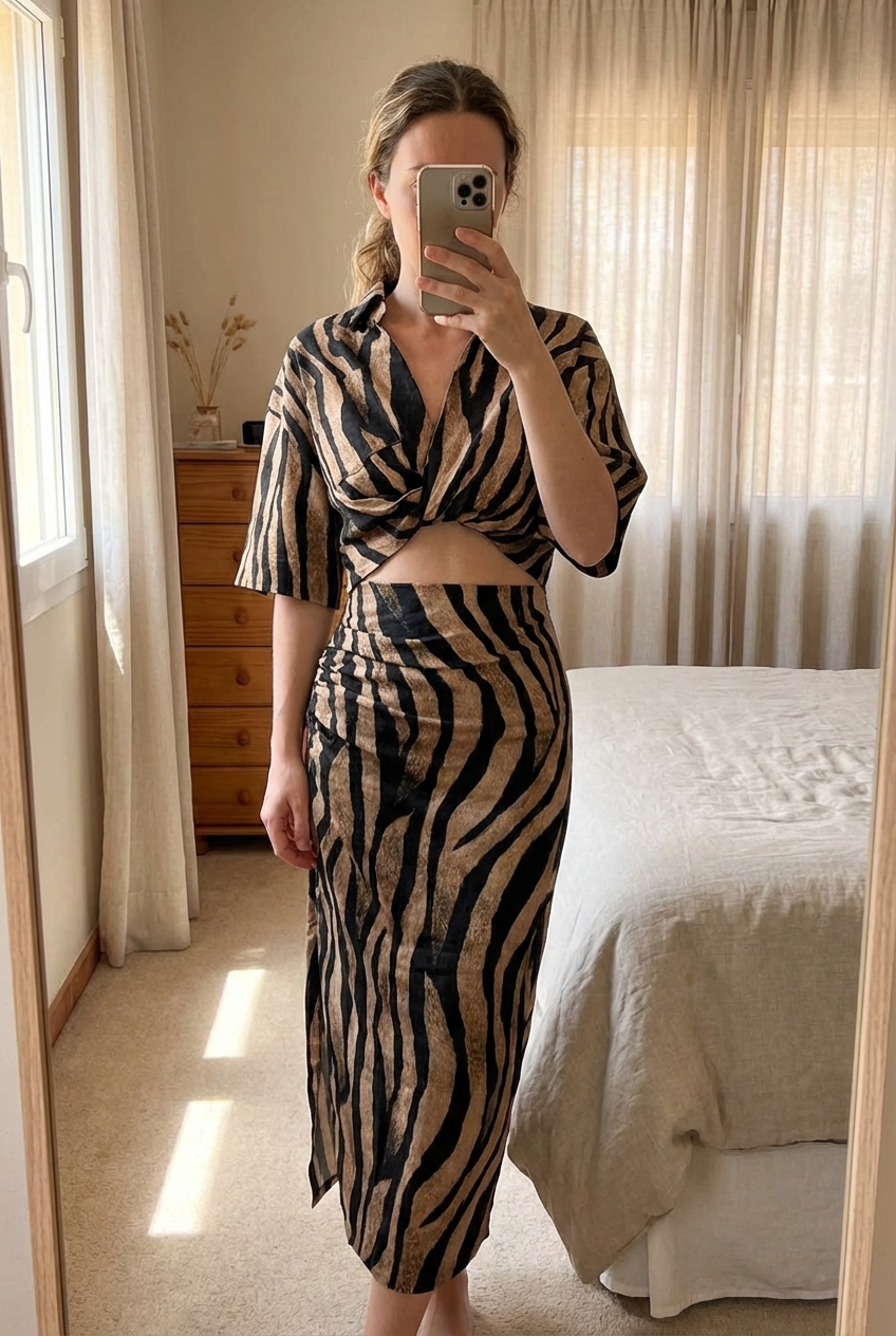 Une personne en Ensemble haut + jupe motif zébré femme small neuf étiqueté debout, face à la caméra, dans une chambre à la lumière douce, avec une lumière naturelle filtrant par la fenêtre.