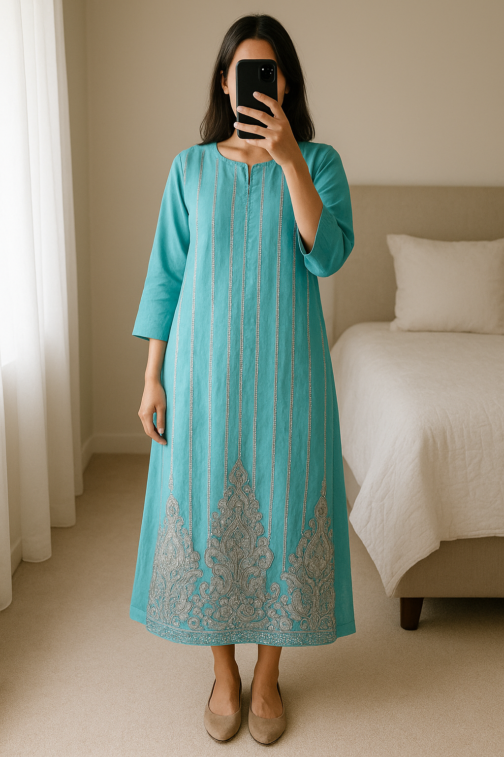Ensemble pakistanais indien debout, face à la caméra, dans une chambre à la lumière douce, avec une lumière naturelle filtrant par la fenêtre.