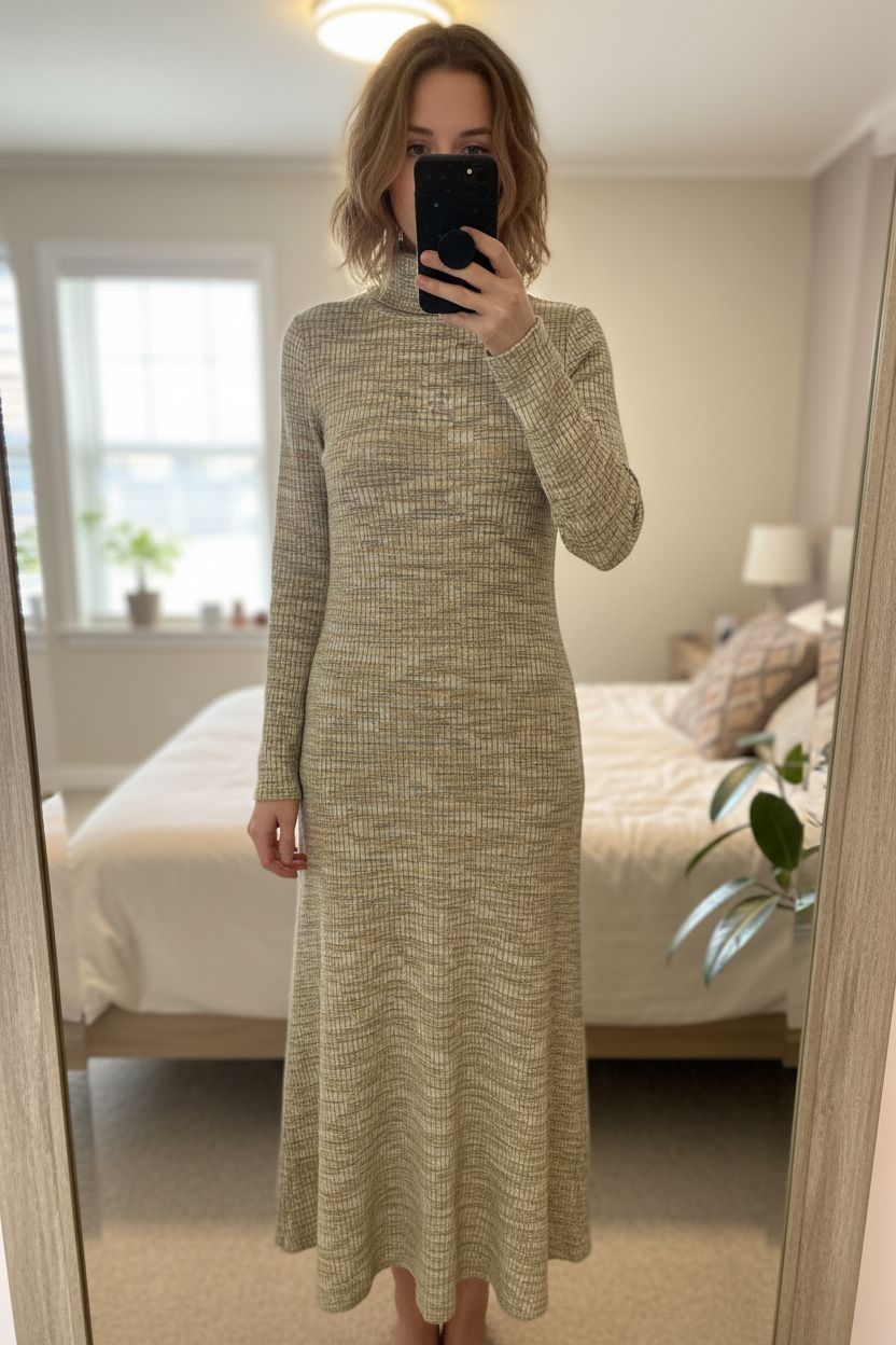 Enviably Green: Boohoo's Knitted Dream Dress (Size XS) standing straight facing the camera, in a softly lit bedroom setting, with gentle natural light filtering through a window.