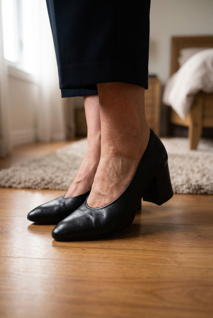 Escarpins cuir debout, face à la caméra, dans une chambre à la lumière douce, avec une lumière naturelle filtrant par la fenêtre.