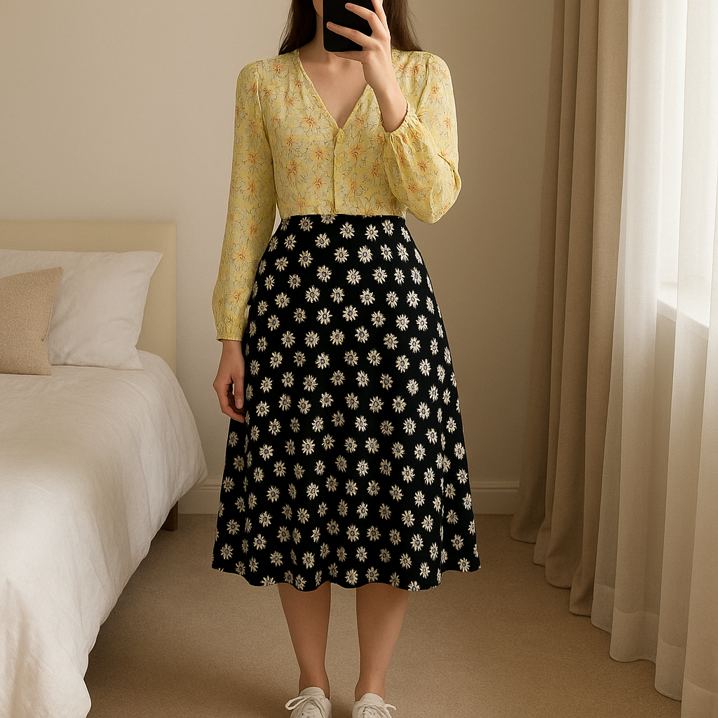 Excellent Condition Daisy Dress standing straight facing the camera, in a softly lit bedroom setting, with gentle natural light filtering through a window.