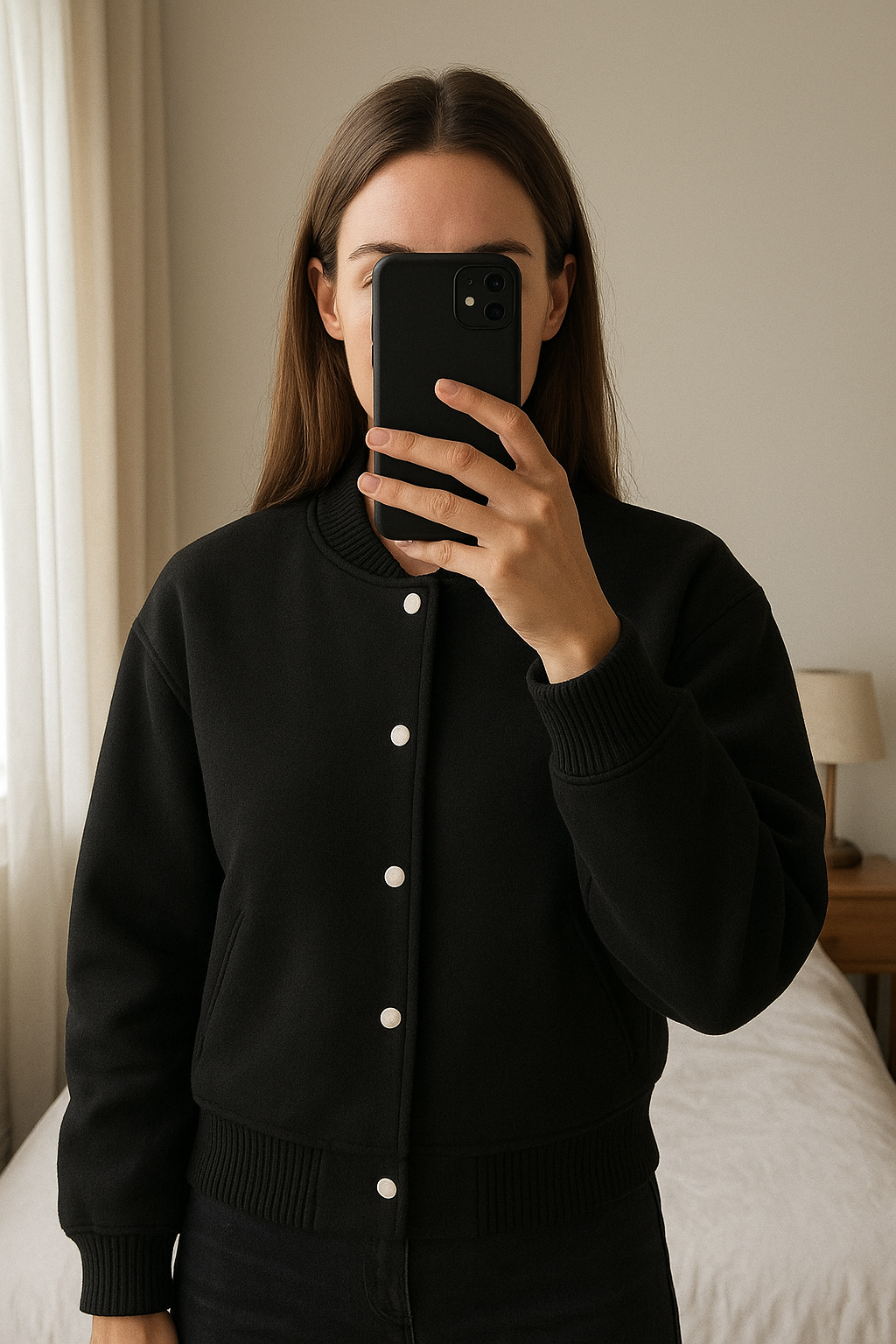 F&F black bomber Jacket size small new with tags standing straight facing the camera, in a softly lit bedroom setting, with gentle natural light filtering through a window.