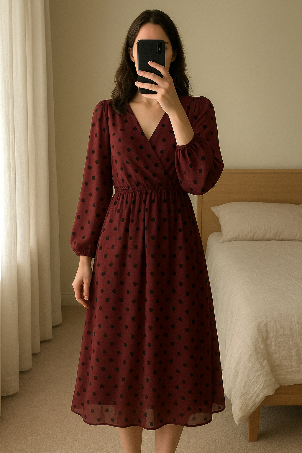 F&F burgundy and black polka dot dress size 6 standing straight facing the camera, in a softly lit bedroom setting, with gentle natural light filtering through a window.