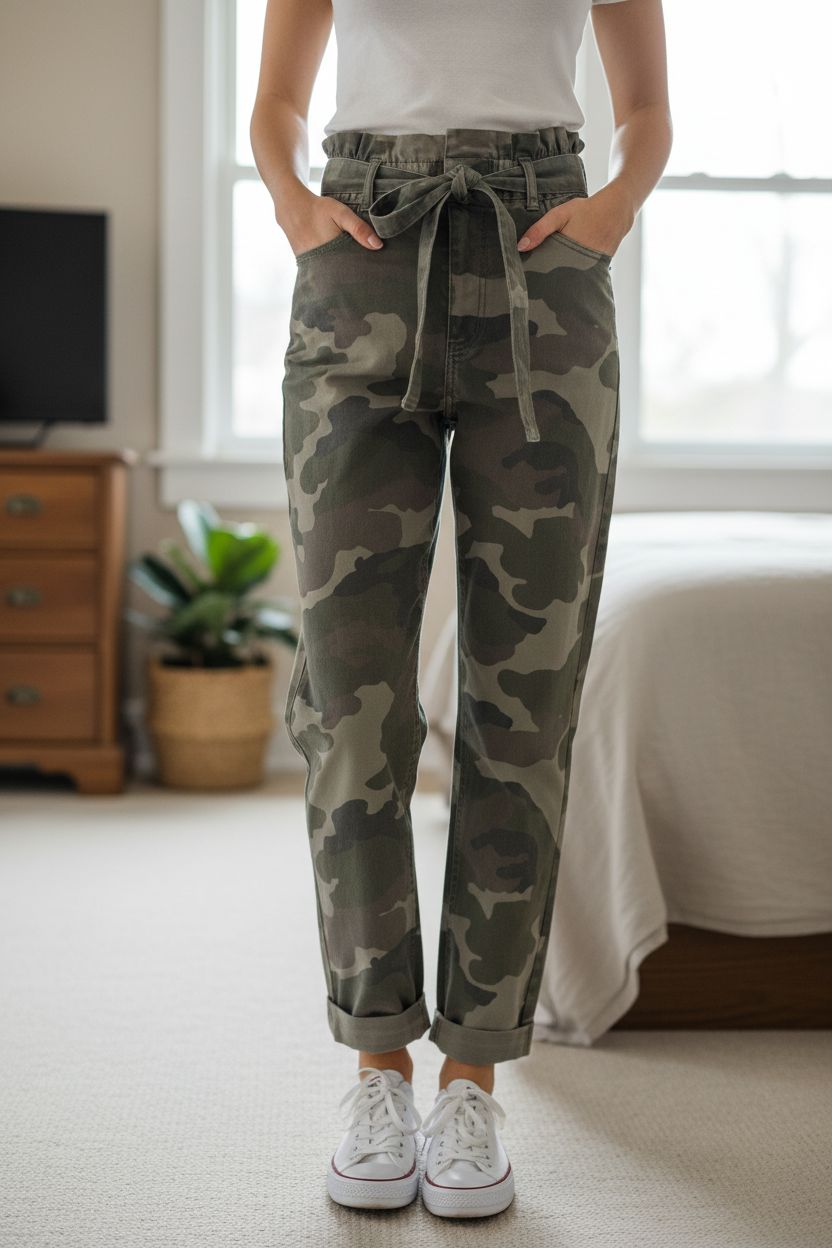 F&F High‑Waist Camo Trousers Size 6 Belted, Paperbag Waist standing straight facing the camera, in a softly lit bedroom setting, with gentle natural light filtering through a window.