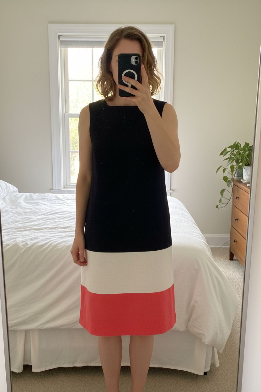 F&F Linen Blend Shift Dress UK16 Black Colour Block Smart Minimalist standing straight facing the camera, in a softly lit bedroom setting, with gentle natural light filtering through a window.