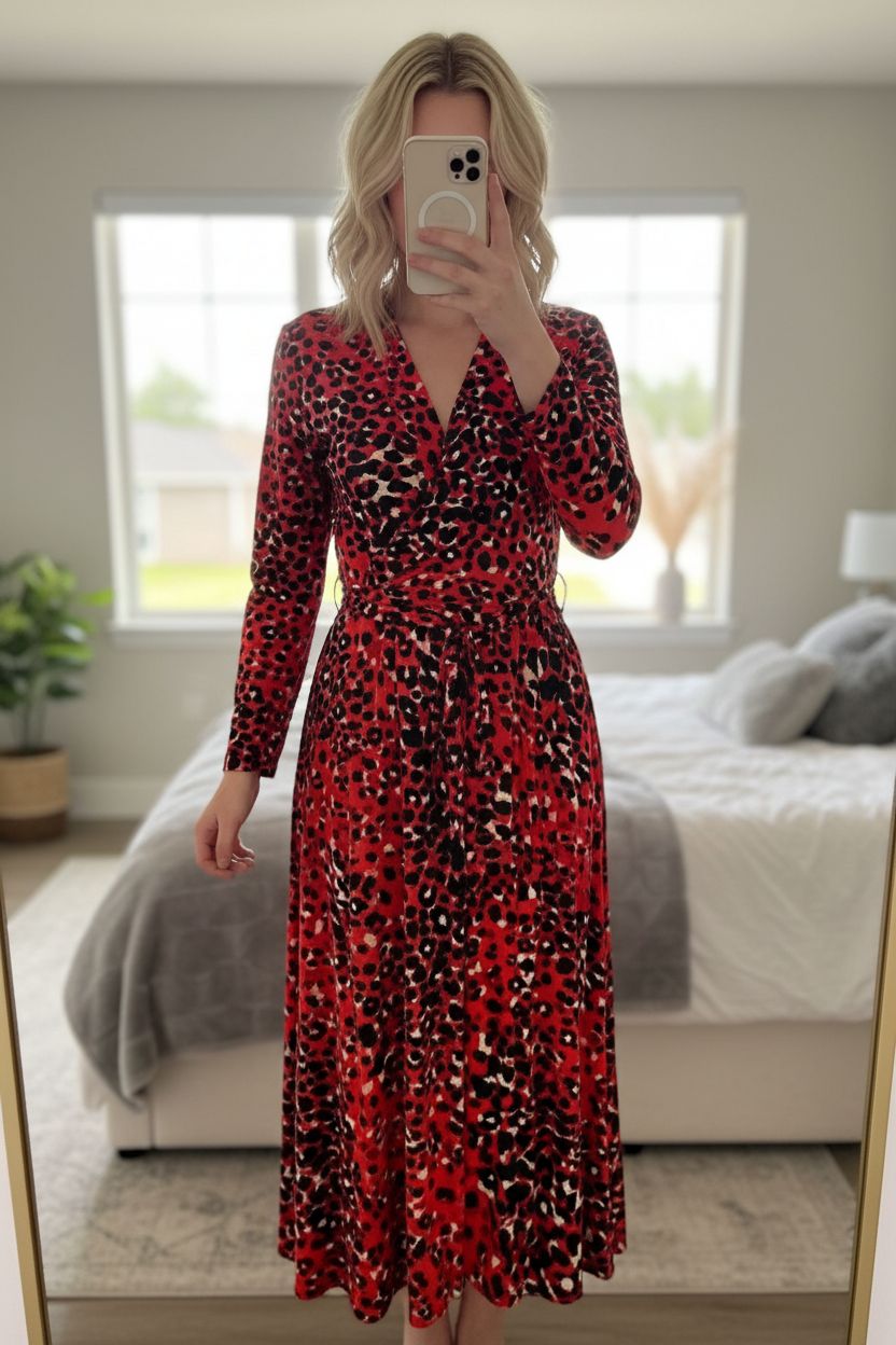 F&F Red Leopard Print Midi Wrap Dress UK16 Dopamine MobWife Statement Glam standing straight facing the camera, in a softly lit bedroom setting, with gentle natural light filtering through a window.