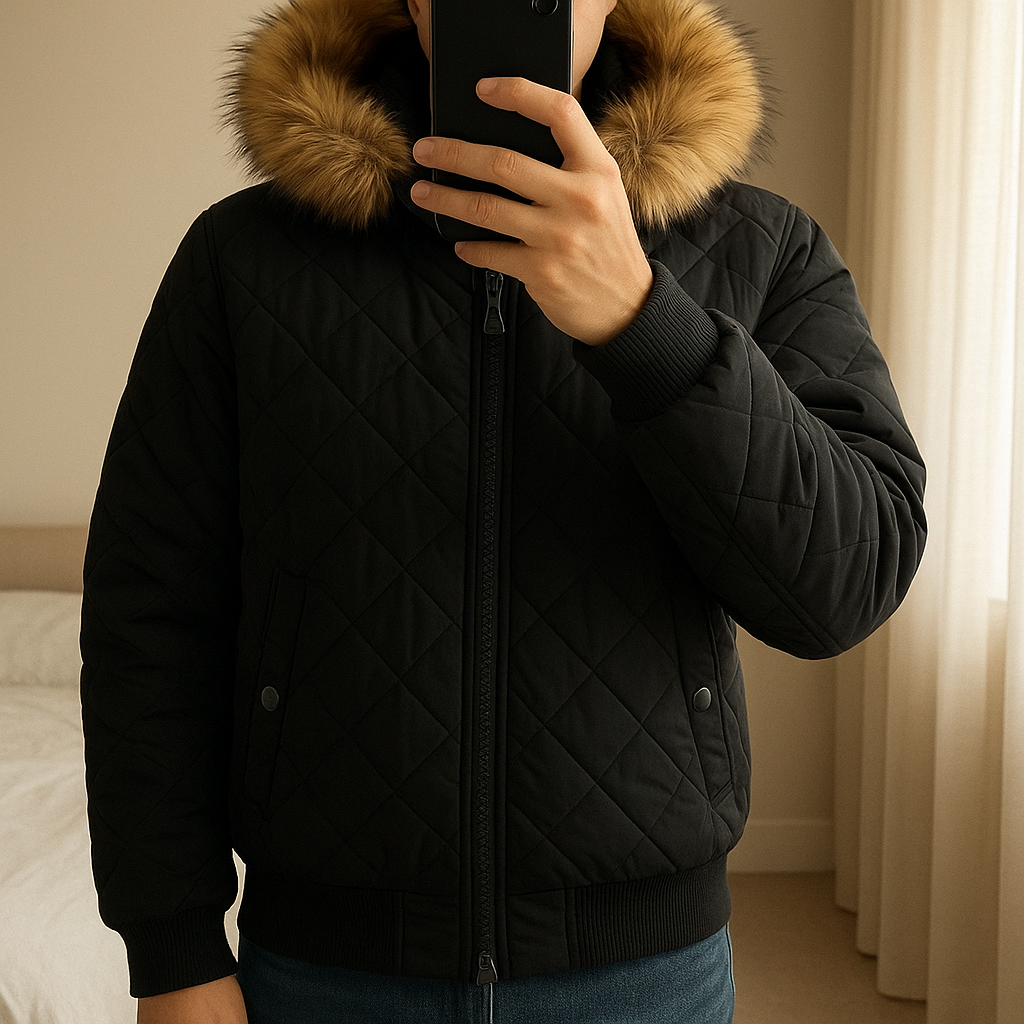 Fake fur jacket veste street wear Y2k bomber Alaska cropped debout, face à la caméra, dans une chambre à la lumière douce, avec une lumière naturelle filtrant par la fenêtre.
