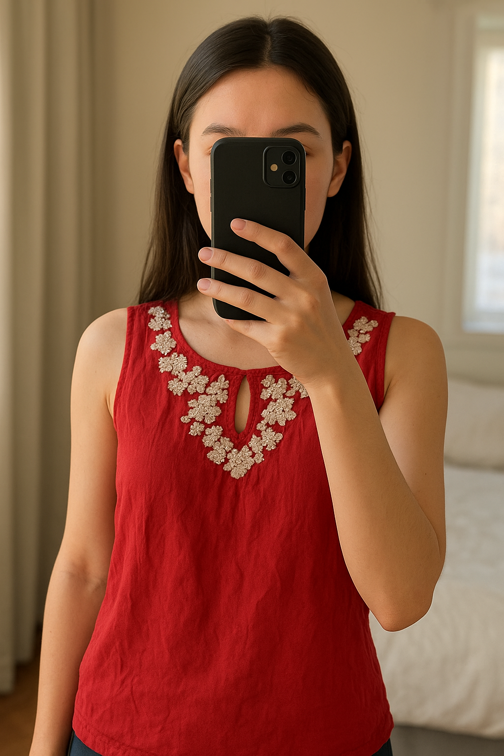 Fancy Red Top ZARA em pé, de frente para a câmera, em um quarto com iluminação suave e luz natural filtrando pela janela.