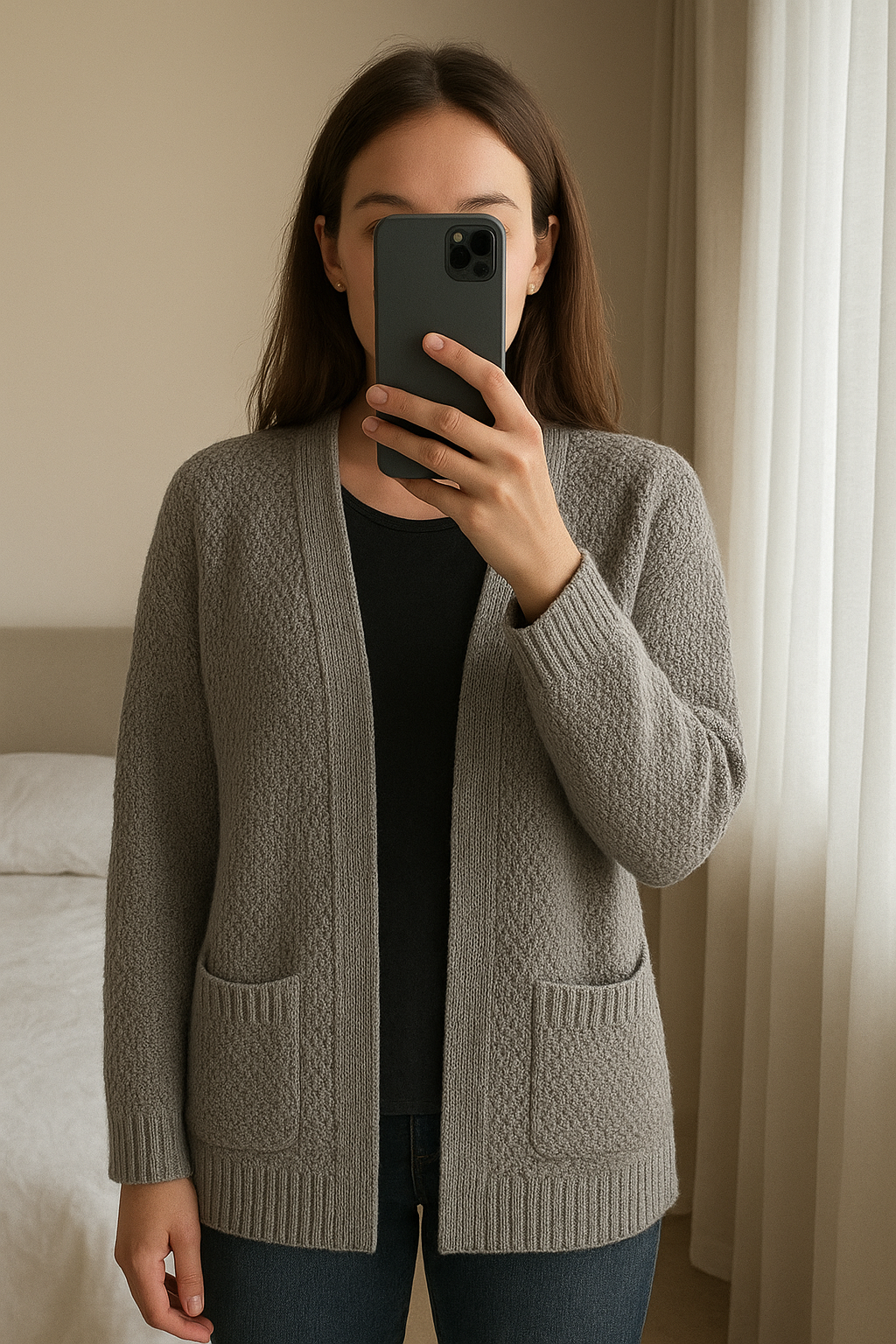 Fat face Cardigan standing straight facing the camera, in a softly lit bedroom setting, with gentle natural light filtering through a window.