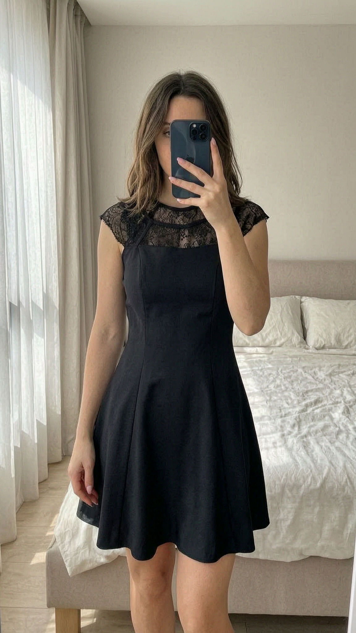 fekete alkalmi ruha standing straight facing the camera, in a softly lit bedroom setting, with gentle natural light filtering through a window.