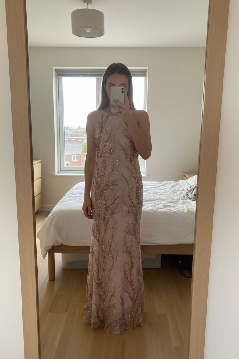 Fish tail full length dress standing straight facing the camera, in a softly lit bedroom setting, with gentle natural light filtering through a window.