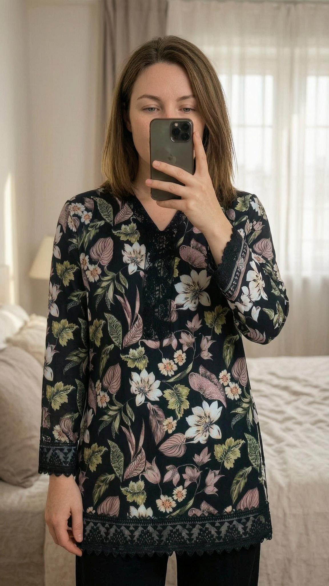 Floral Asian Casual Wear standing straight facing the camera, in a softly lit bedroom setting, with gentle natural light filtering through a window.