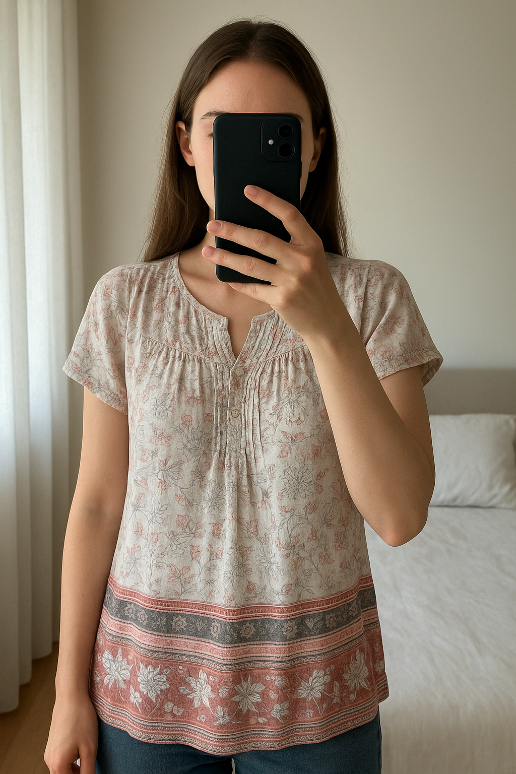 Floral blouse standing straight facing the camera, in a softly lit bedroom setting, with gentle natural light filtering through a window.