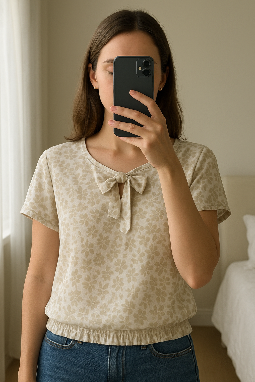 Floral T-shirt standing straight facing the camera, in a softly lit bedroom setting, with gentle natural light filtering through a window.