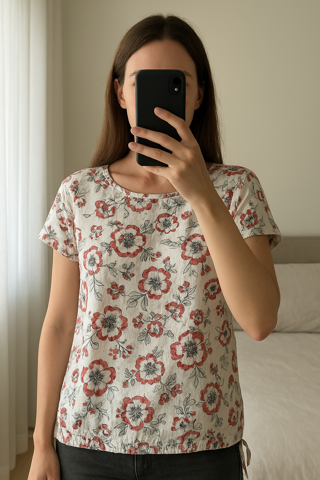 Floral T-shirt standing straight facing the camera, in a softly lit bedroom setting, with gentle natural light filtering through a window.