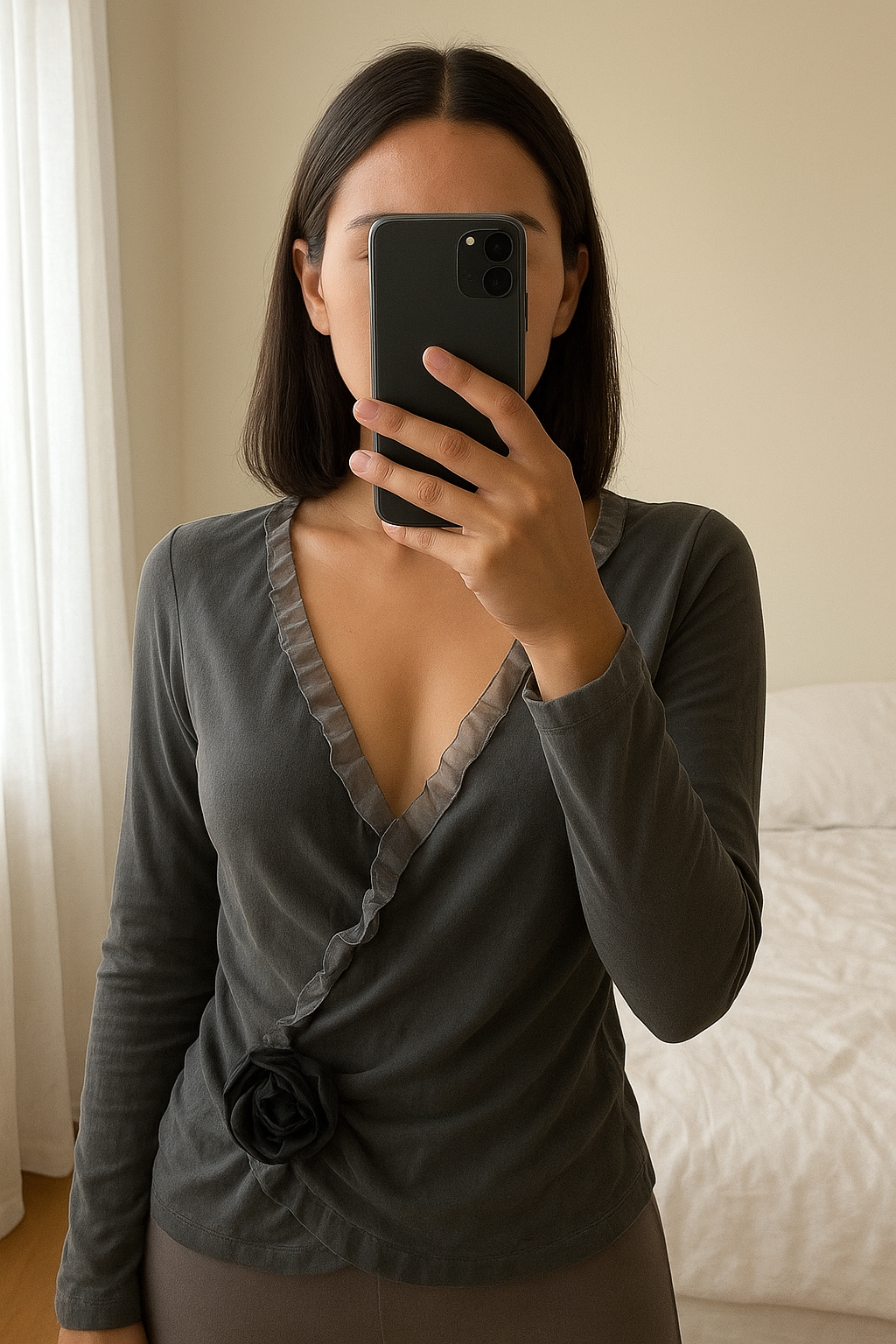 Une personne en Flowy fairy long sleeve y2K shirt debout, face à la caméra, dans une chambre à la lumière douce, avec une lumière naturelle filtrant par la fenêtre.