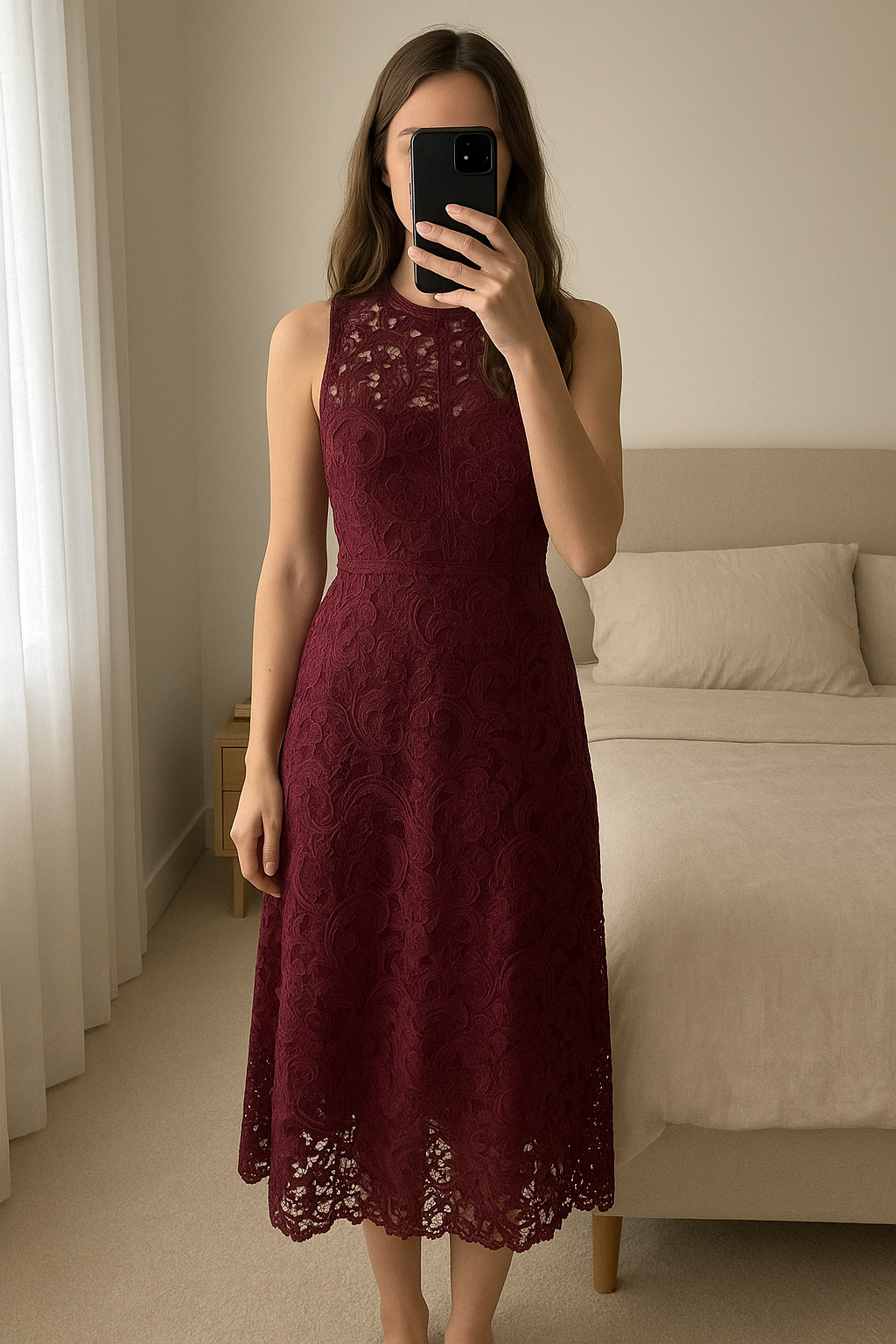 Forever Unique Dress Size 10 standing straight facing the camera, in a softly lit bedroom setting, with gentle natural light filtering through a window.