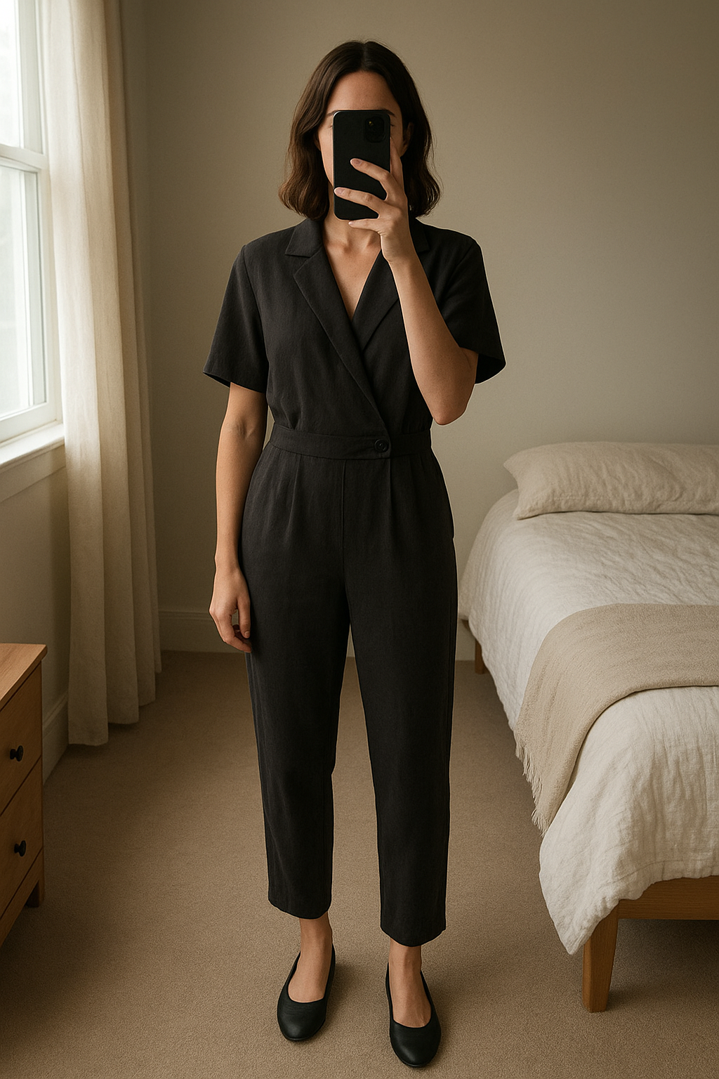French Connection grey linen jumpsuit size 16 standing straight facing the camera, in a softly lit bedroom setting, with gentle natural light filtering through a window.