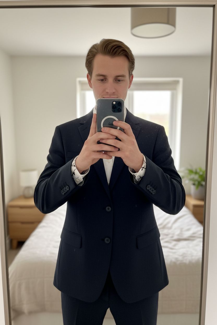 French connections men’s brand new three piece suit standing straight facing the camera, in a softly lit bedroom setting, with gentle natural light filtering through a window.