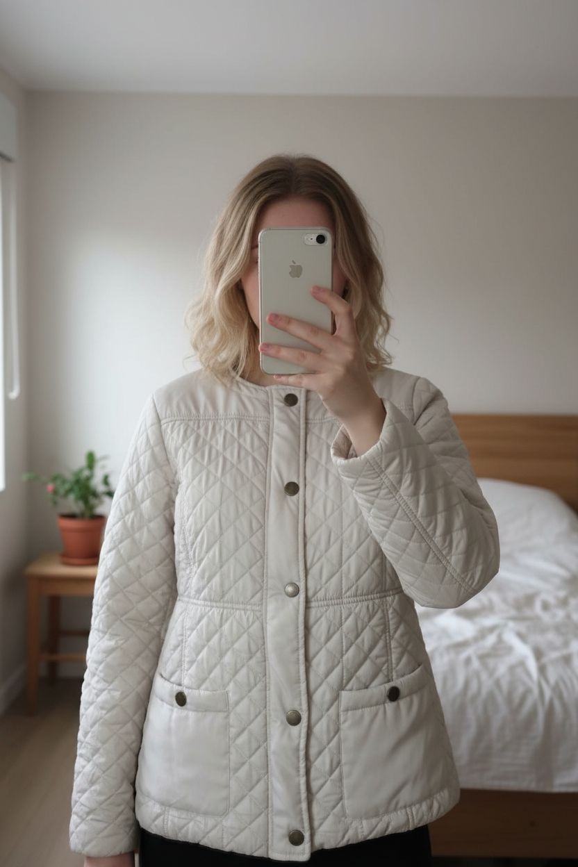 Gabriella Vicenza átmeneti kabát standing straight facing the camera, in a softly lit bedroom setting, with gentle natural light filtering through a window.