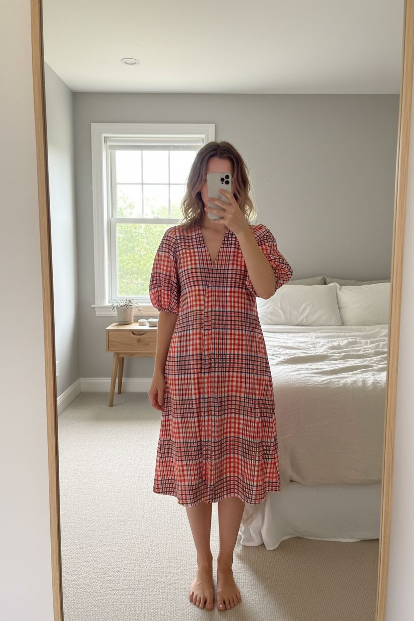GANNI Red Check Puff Sleeve Dress – Size 36 (UK 8) standing straight facing the camera, in a softly lit bedroom setting, with gentle natural light filtering through a window.