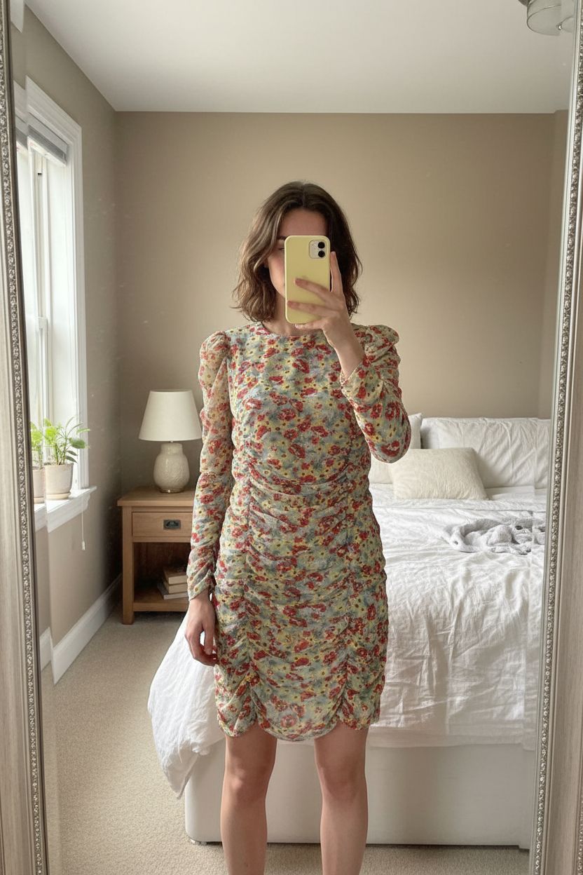 GANNI ruched floral print mesh mini dress UK 8-10 standing straight facing the camera, in a softly lit bedroom setting, with gentle natural light filtering through a window.