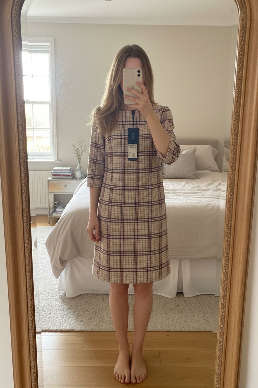 Gant check dress cream red navy plaid, size UK 8 (EU 34) BNWT designer light academia tartan preppie standing straight facing the camera, in a softly lit bedroom setting, with gentle natural light filtering through a window.