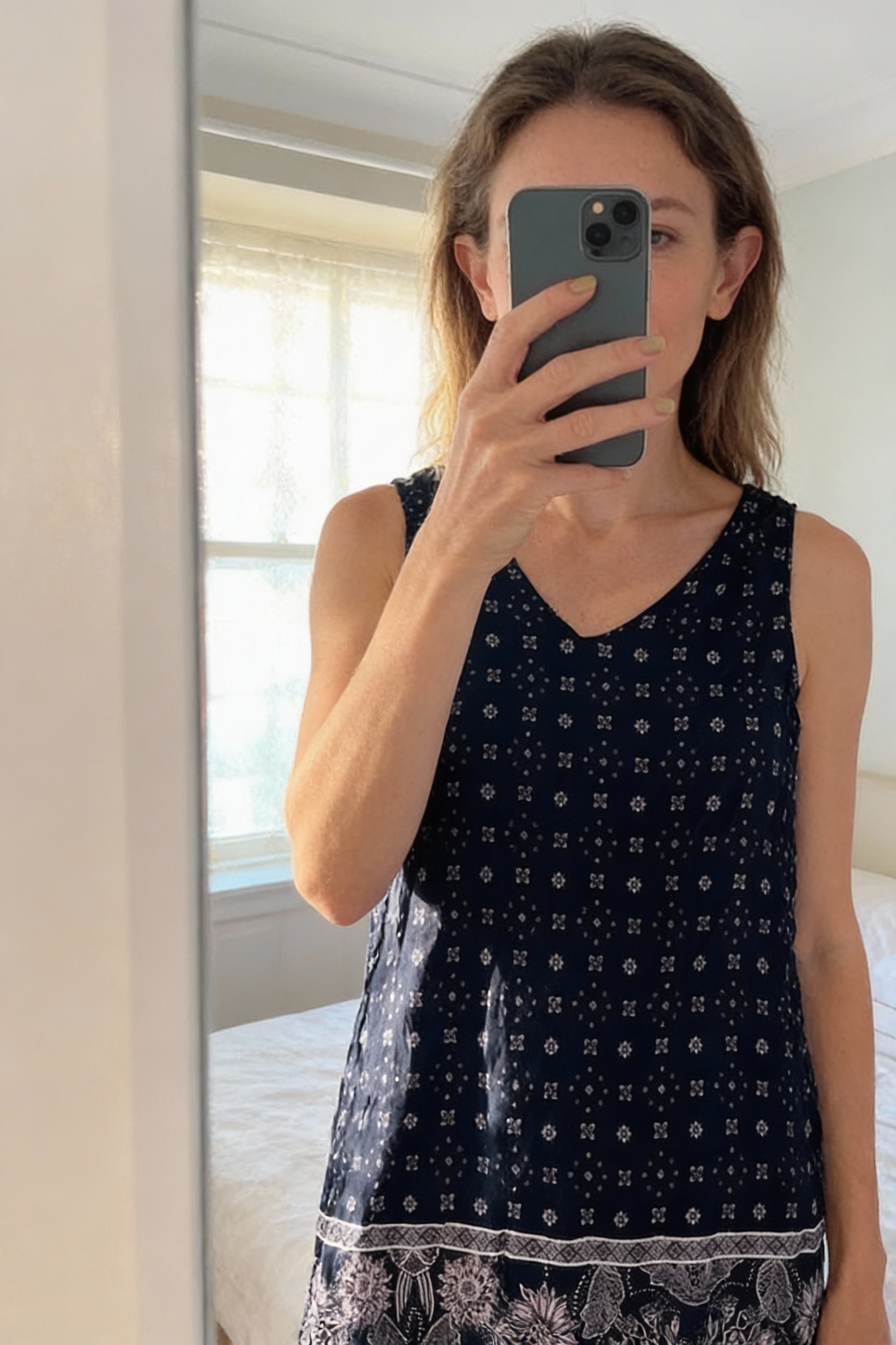 Gap tunic standing straight facing the camera, in a softly lit bedroom setting, with gentle natural light filtering through a window.