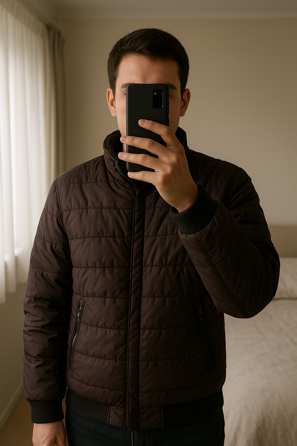Geaca standing straight facing the camera, in a softly lit bedroom setting, with gentle natural light filtering through a window.