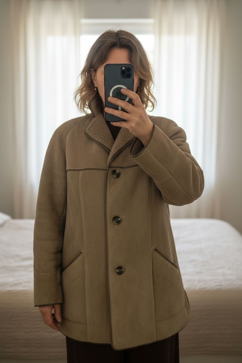 Genuine lambs wool Coat - Ladies standing straight facing the camera, in a softly lit bedroom setting, with gentle natural light filtering through a window.