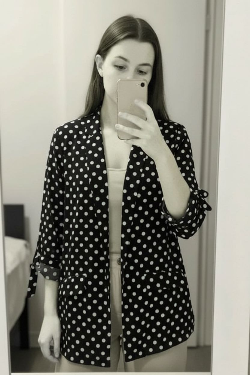 George Polka Dot Jacket Blazer Black White Tie Sleeve UK18 French Woman Plus standing straight facing the camera, in a softly lit bedroom setting, with gentle natural light filtering through a window.