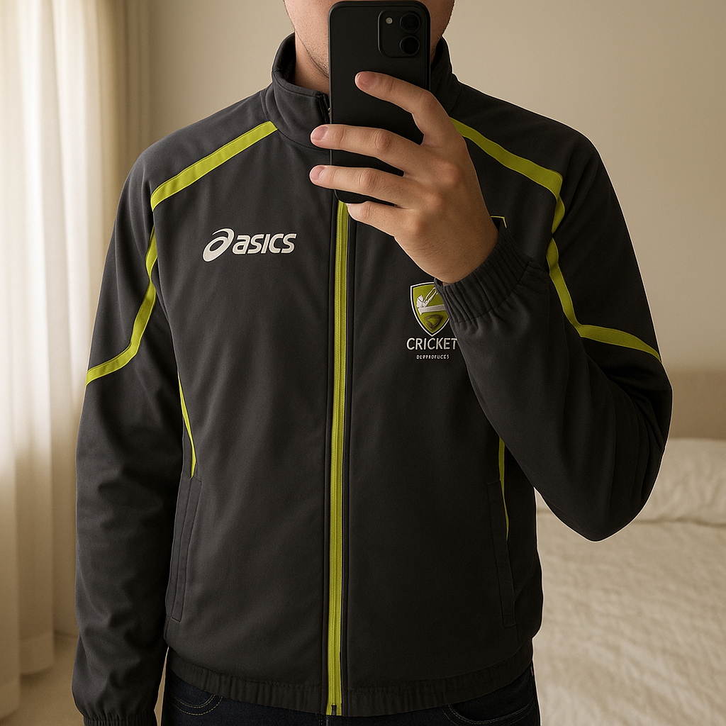 Giacca Asics “Cricket Australia” soft shell, stile sportivo in piedi, rivolto verso la fotocamera, in una camera da letto con luce soffusa e luce naturale che filtra dalla finestra.