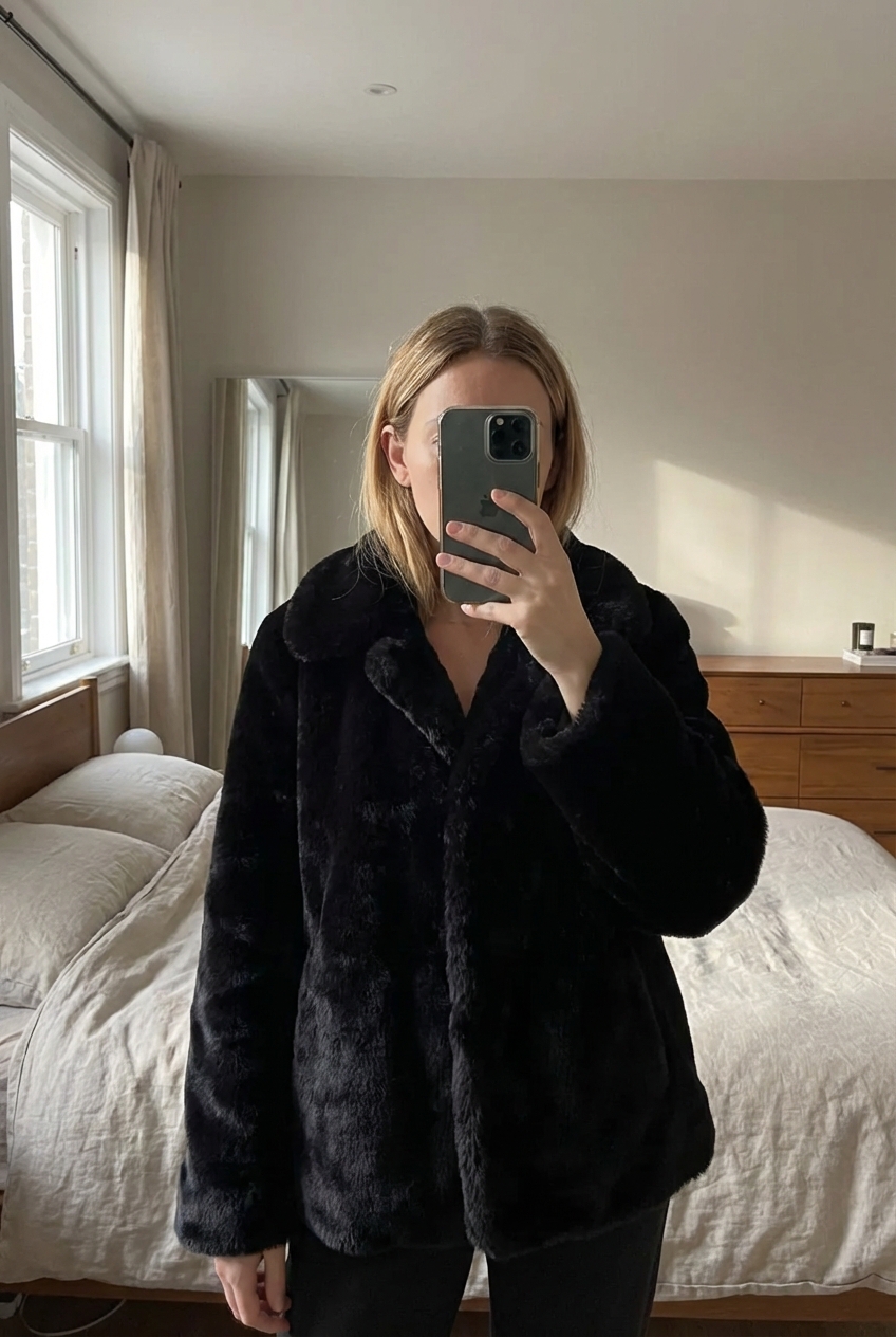 giacca manica 3/4 in eco pelliccia nero taglia unica con bottone al centro made in italy in piedi, rivolto verso la fotocamera, in una camera da letto con luce soffusa e luce naturale che filtra dalla finestra.