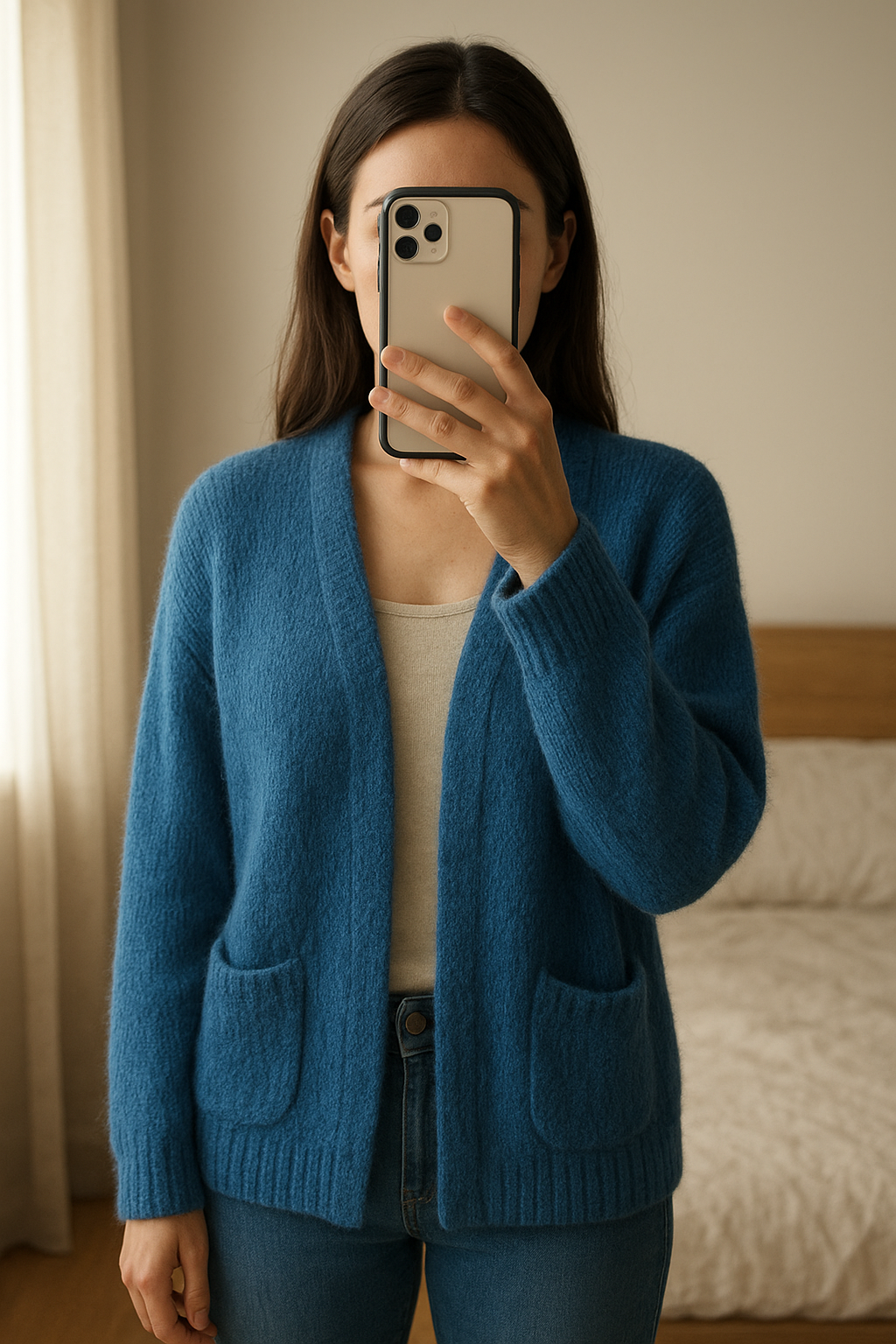 Gilet bleu kid mohair taille 42-44 / boutique italiana debout, face à la caméra, dans une chambre à la lumière douce, avec une lumière naturelle filtrant par la fenêtre.