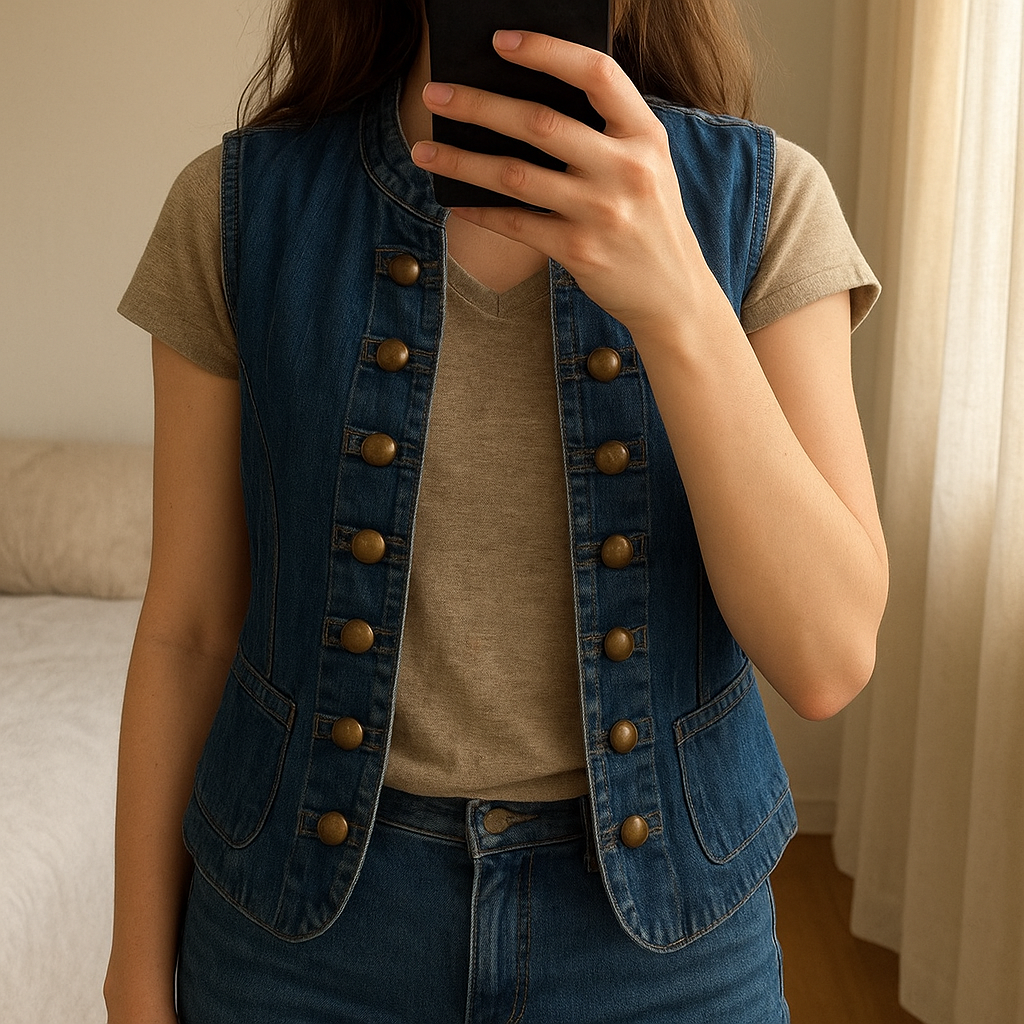 Gilet en jean sans manche debout, face à la caméra, dans une chambre à la lumière douce, avec une lumière naturelle filtrant par la fenêtre.
