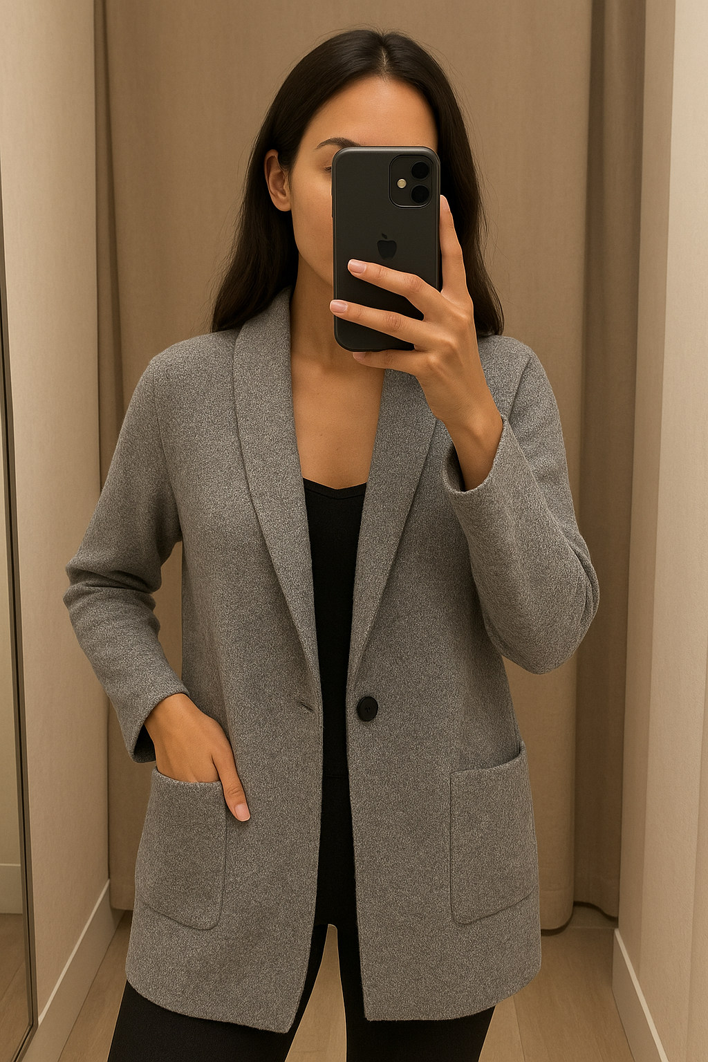 Une personne en Gilet gris Jennyfer cambrant légèrement le dos pour une pose dynamique, avec une silhouette fine, dans une cabine d’essayage de style boutique avec un miroir et une décoration neutre.