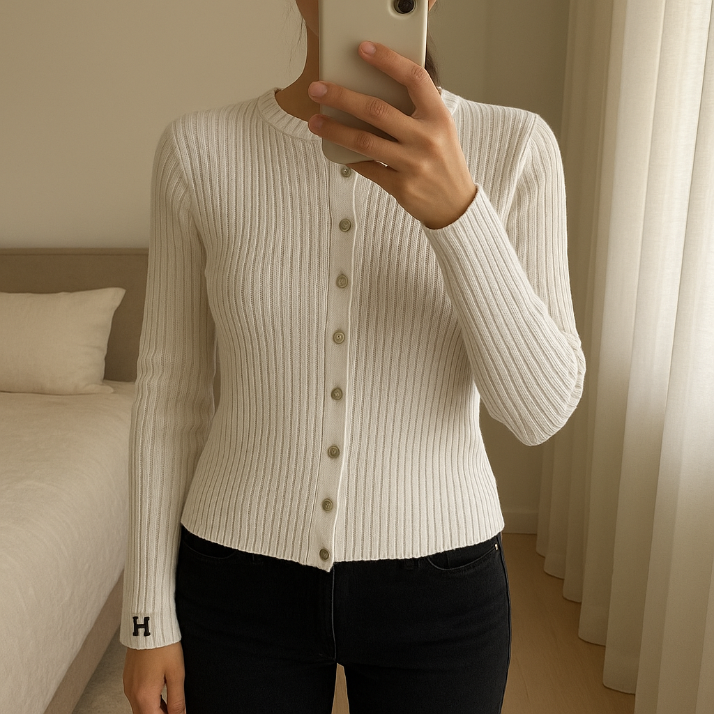 Gilet L Tommy Hilfiger femme blanc cassé 100% coton vintage 2000 (défaut col) debout, face à la caméra, dans une chambre à la lumière douce, avec une lumière naturelle filtrant par la fenêtre.