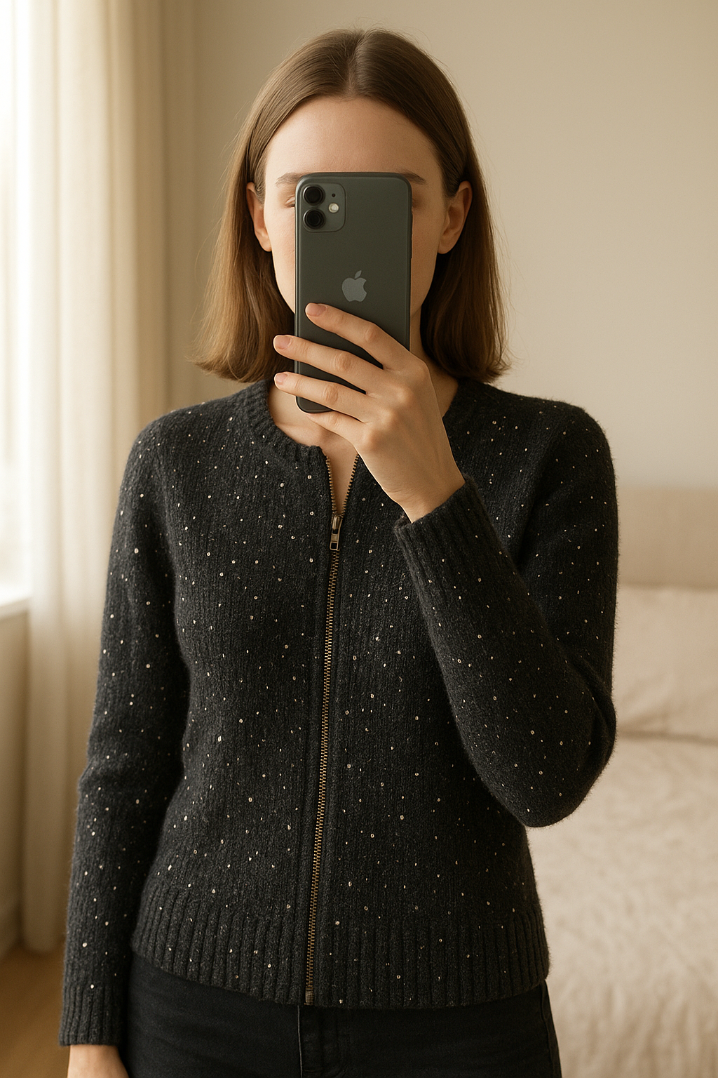 Gilet Le Temps des cerises T38 debout, face à la caméra, dans une chambre à la lumière douce, avec une lumière naturelle filtrant par la fenêtre.