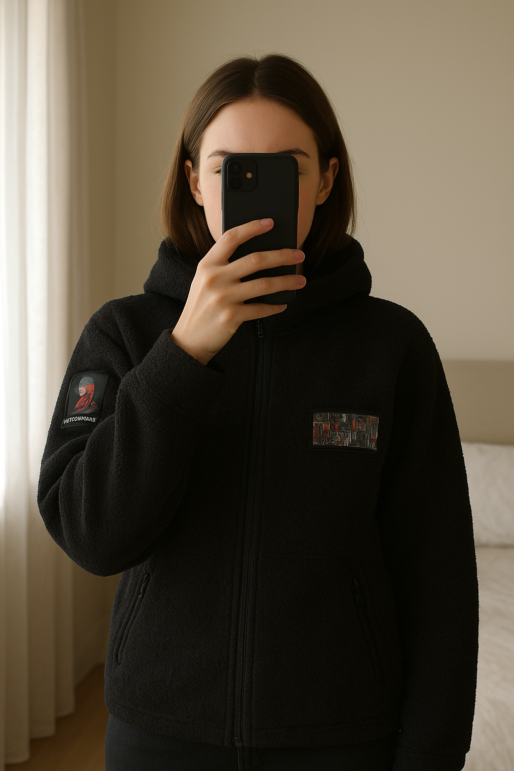 Gilet polaire Derschutze debout, face à la caméra, dans une chambre à la lumière douce, avec une lumière naturelle filtrant par la fenêtre.