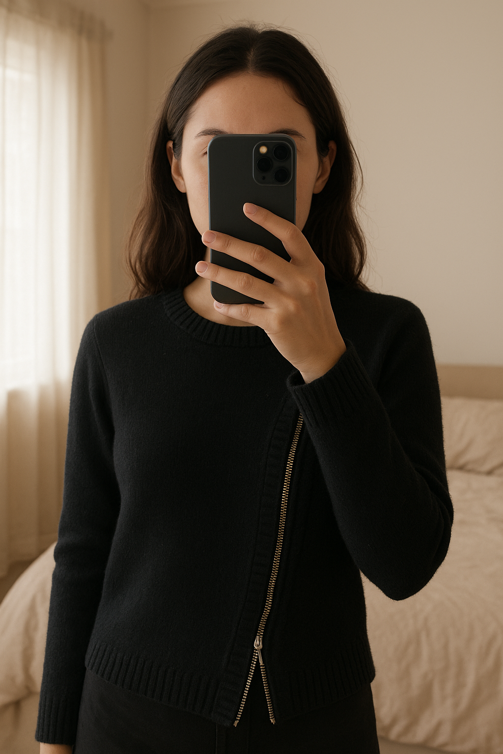 gilet pull hiver zip debout, face à la caméra, dans une chambre à la lumière douce, avec une lumière naturelle filtrant par la fenêtre.