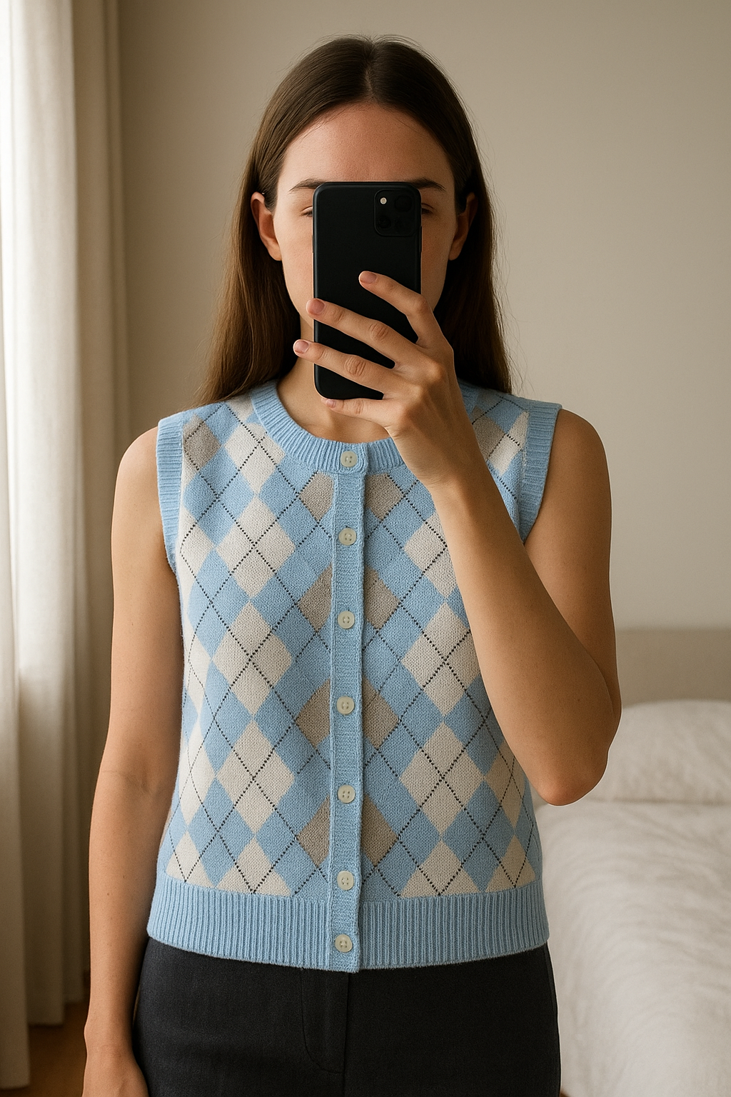 Gilet sans manches Tommy Hilfiger à losanges argyle bleu ciel, beige et blanc – Taille XL debout, face à la caméra, dans une chambre à la lumière douce, avec une lumière naturelle filtrant par la fenêtre.