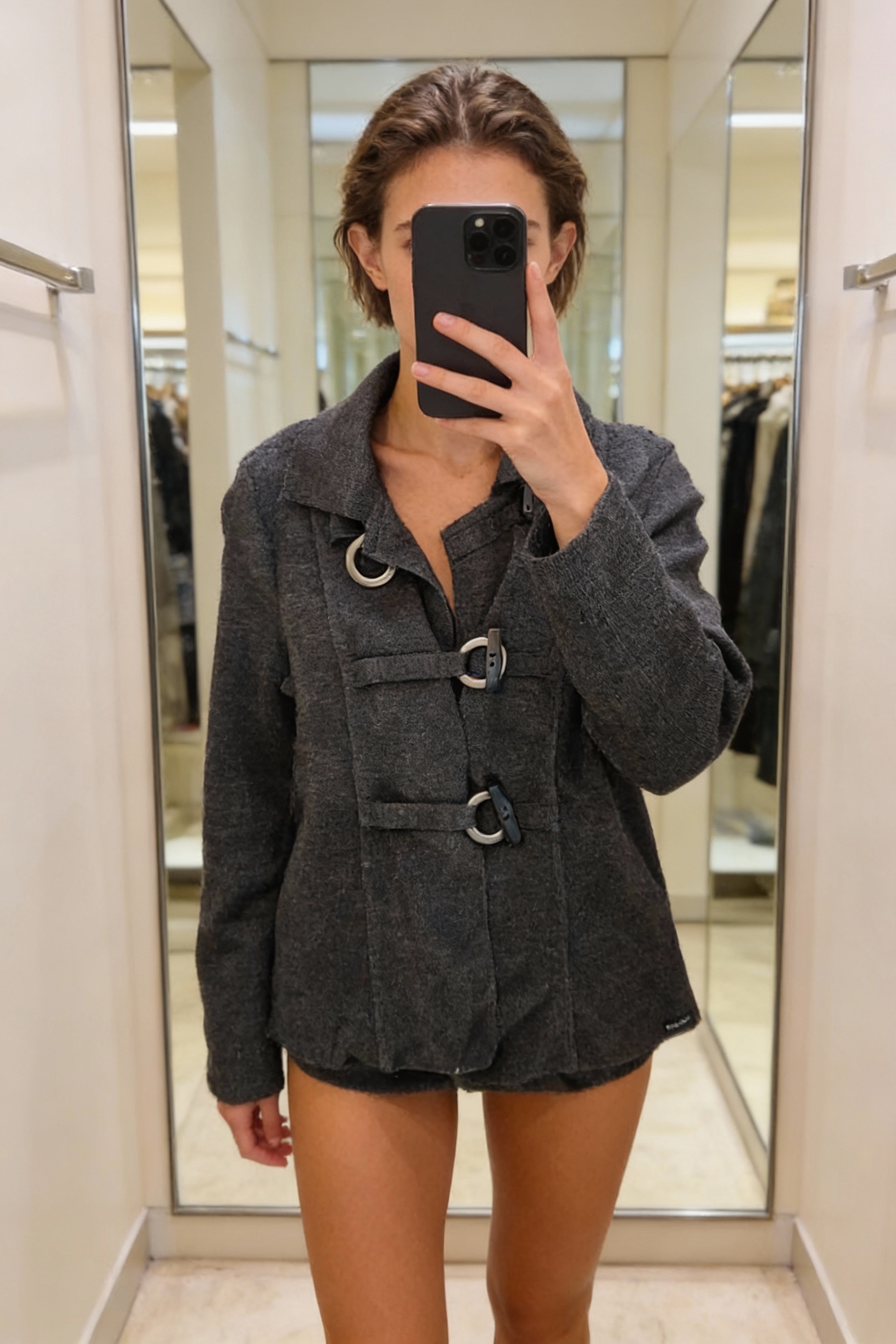 Une personne en Gilet st james debout, face à la caméra, avec une silhouette fine, dans une cabine d’essayage de style boutique avec un miroir et une décoration neutre.