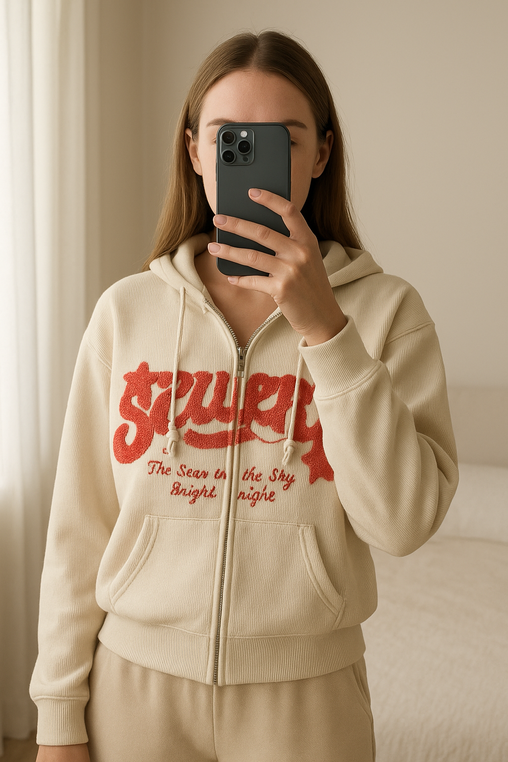 Gilet Vintage Aesthetic Y2K Fashion 80s 90s debout, face à la caméra, dans une chambre à la lumière douce, avec une lumière naturelle filtrant par la fenêtre.