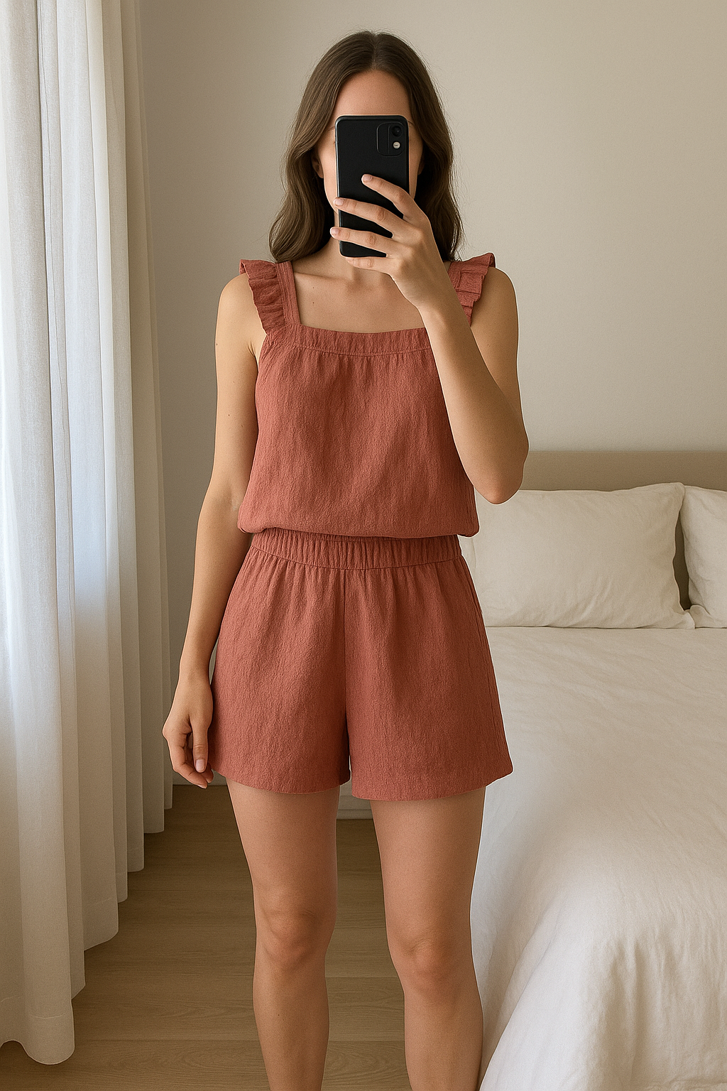 Girls 2-piece Summer Outfit standing straight facing the camera, in a softly lit bedroom setting, with gentle natural light filtering through a window.