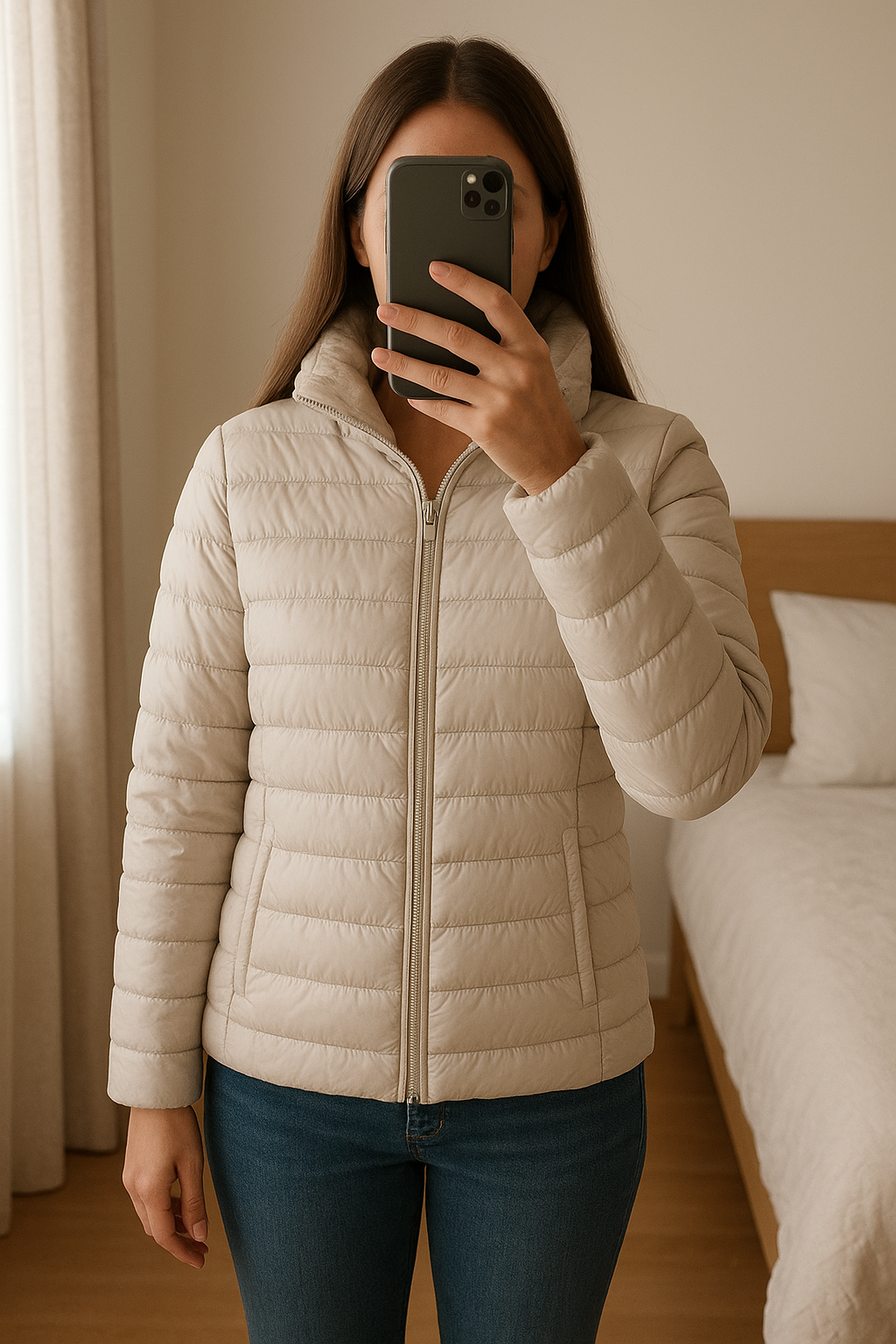 Giubbotto Donna in piedi, rivolto verso la fotocamera, in una camera da letto con luce soffusa e luce naturale che filtra dalla finestra.