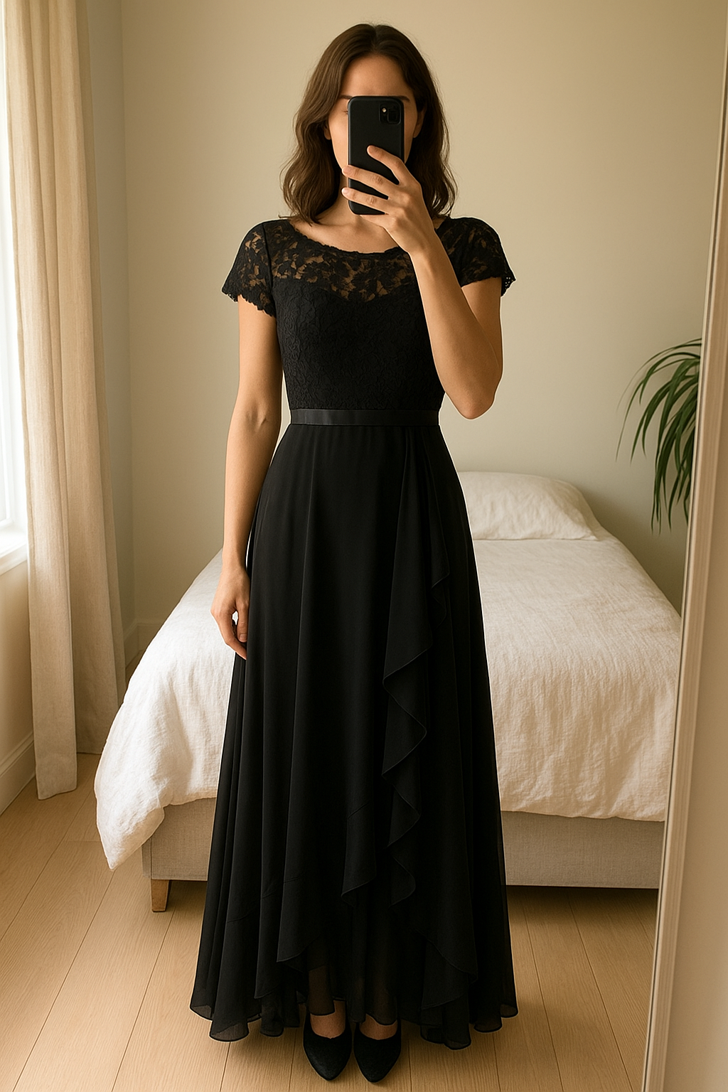 Gorgeous evening dress size 18 standing straight facing the camera, in a softly lit bedroom setting, with gentle natural light filtering through a window.