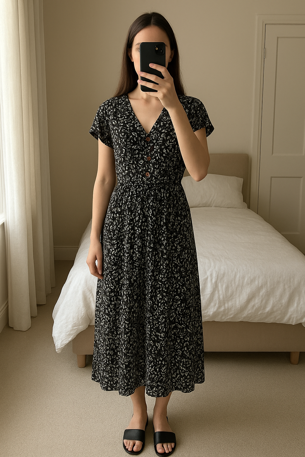 Gorgeous size 22 black & white jumpsuit from George standing straight facing the camera, in a softly lit bedroom setting, with gentle natural light filtering through a window.