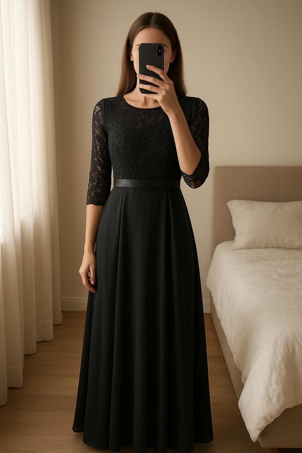 Gorgeous teal lace & chiffon dress standing straight facing the camera, in a softly lit bedroom setting, with gentle natural light filtering through a window.