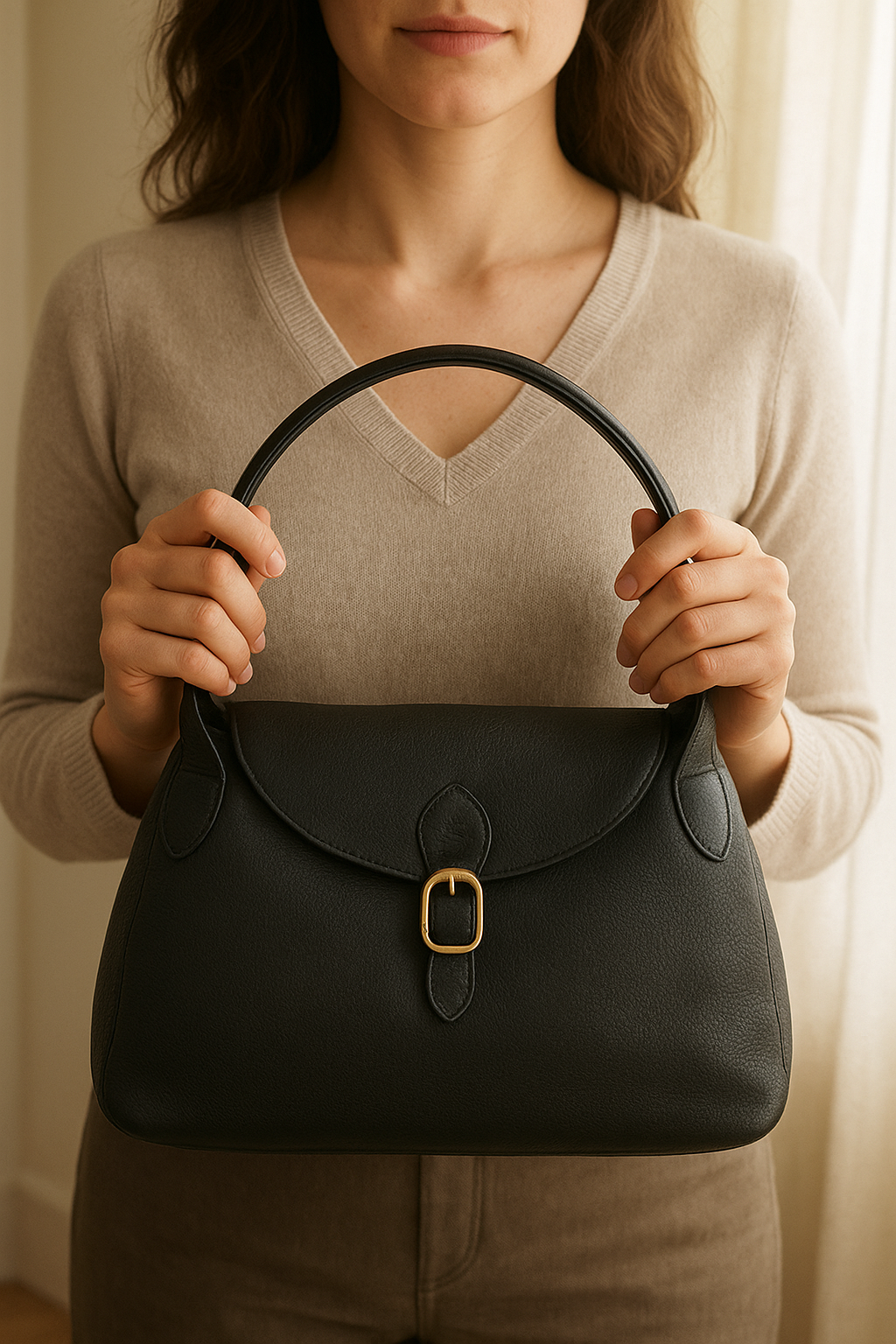 Grand Sac à main Vintage Longchamp cuir grainé noir debout, face à la caméra, dans une chambre à la lumière douce, avec une lumière naturelle filtrant par la fenêtre.