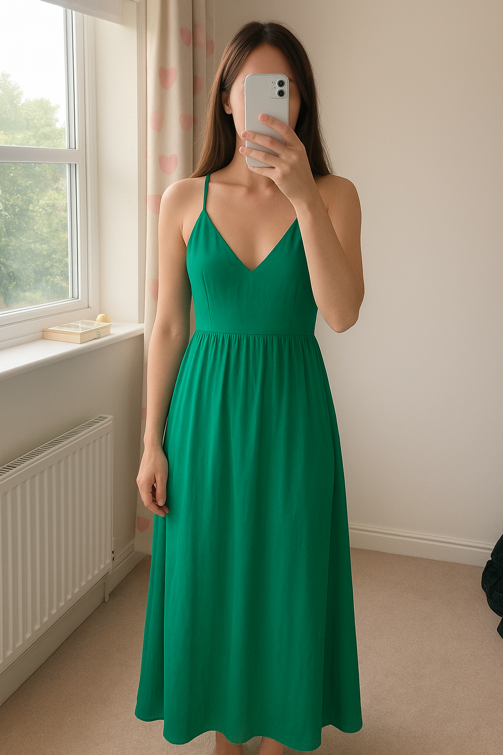 Green long summer dress standing straight facing the camera, in a softly lit bedroom setting, with gentle natural light filtering through a window.